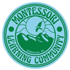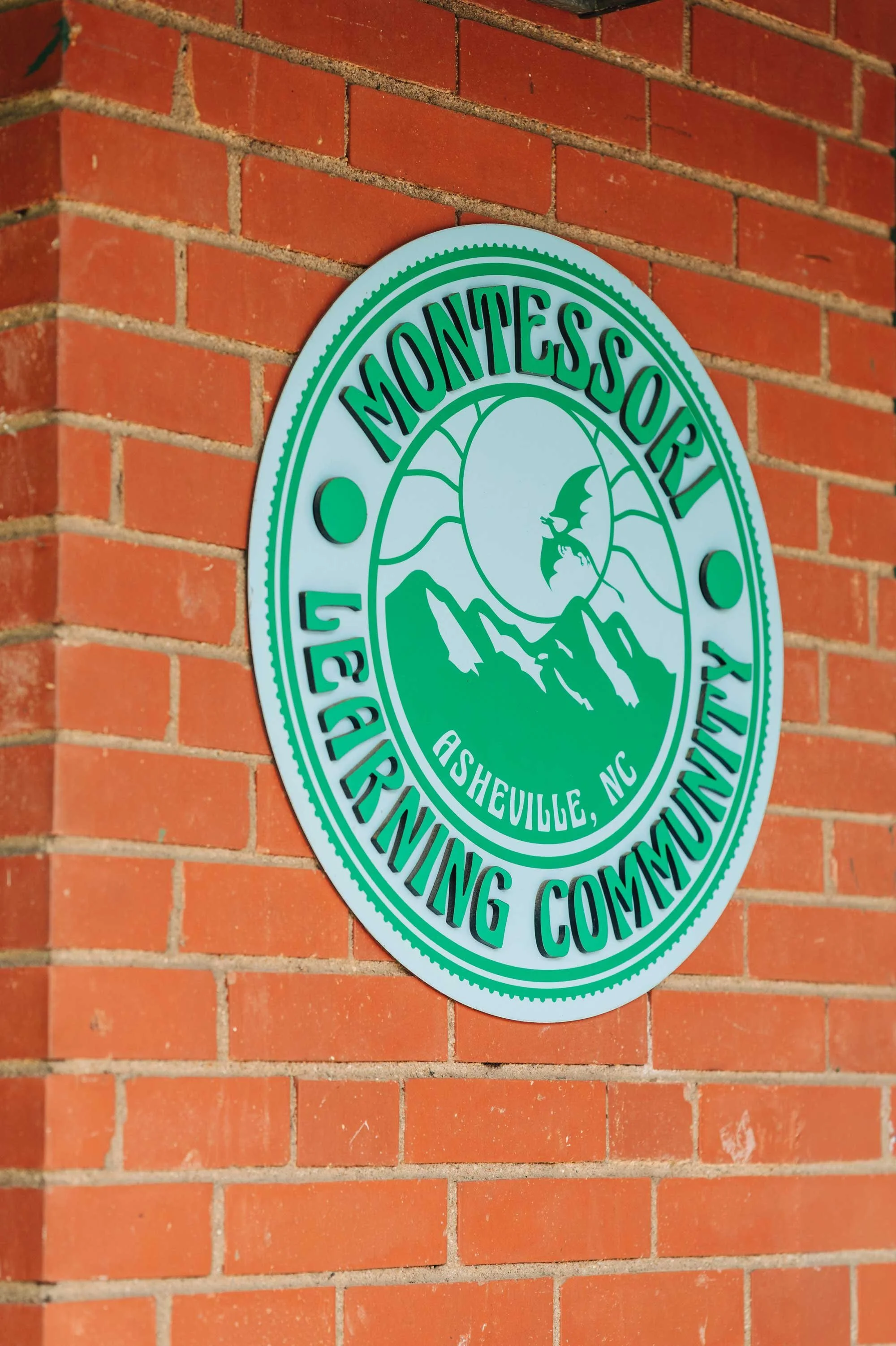 Green circular logo for Montessorig Community in Asheville, North Carolina, featuring a mountain landscape with a full moon and a stylized bird in flight.